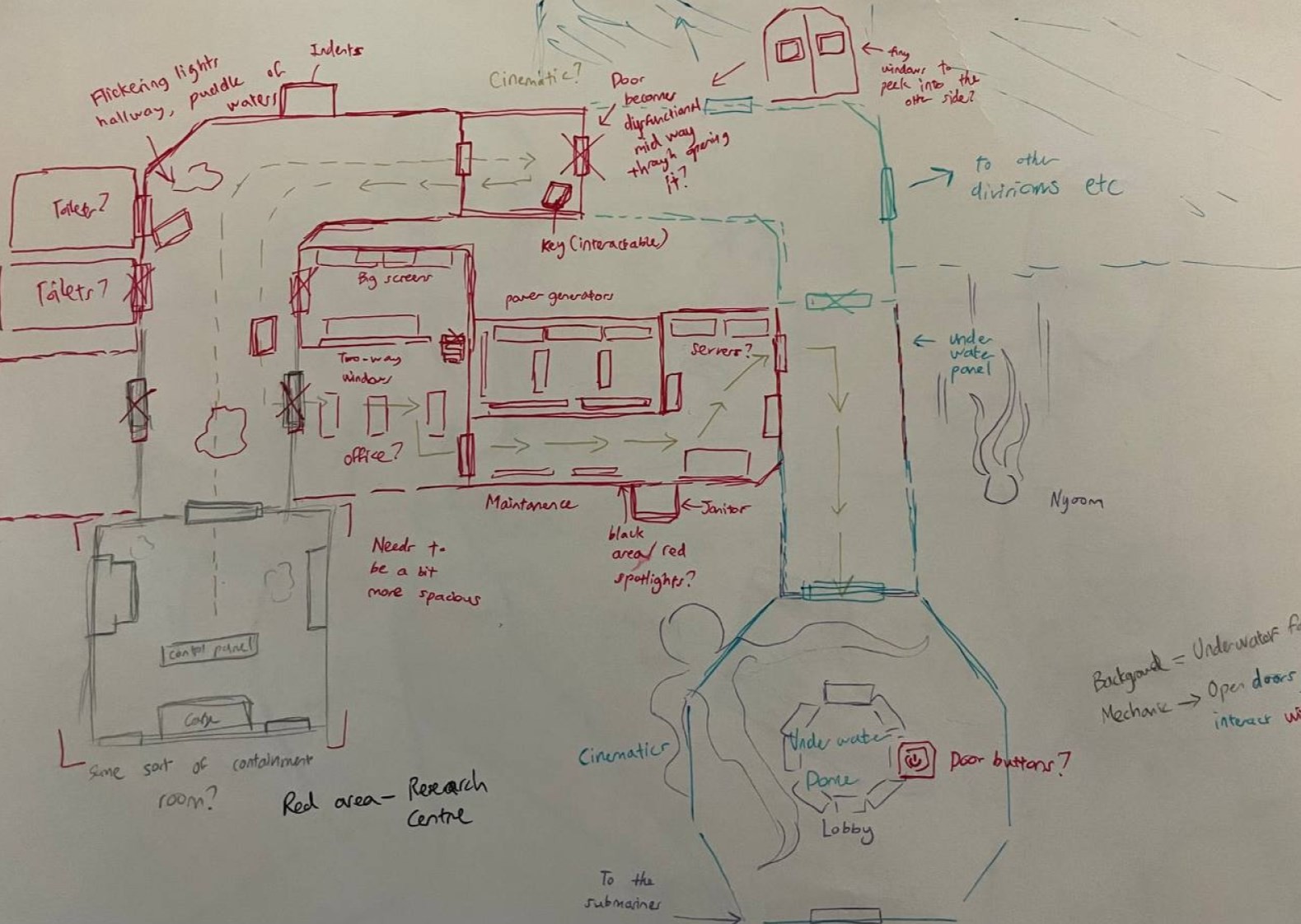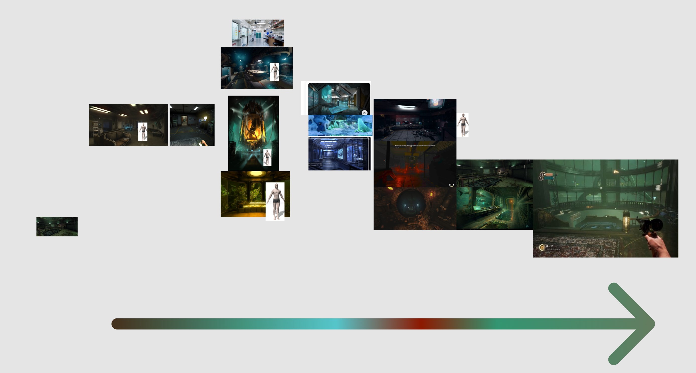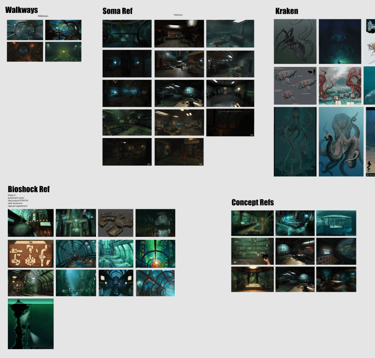 Some members, including myself, decided to establish AEGIR's context and mood with a reference board. This included understanding the spatial constraints of underwater facilities as we know in the modern day, alongside taking inspiration from other games with similar premises.