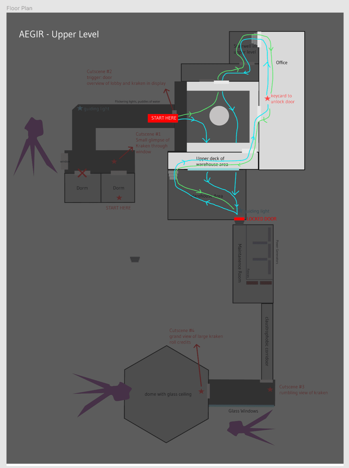 The other half of our team worked on the level design directly, first drafting out what the level could look like on a whiteboard before solidifying the designs on Figma. This included a colour mapping of the level in its entirety to demonstrate progression and atmosphere, and deciding upon crucial landmarks of the level.