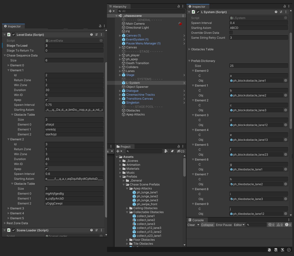 In an attempt to streamline our game's level design, I wanted to test out a proposed grammar system that would allow me to deploy obstacles based on string input alone.