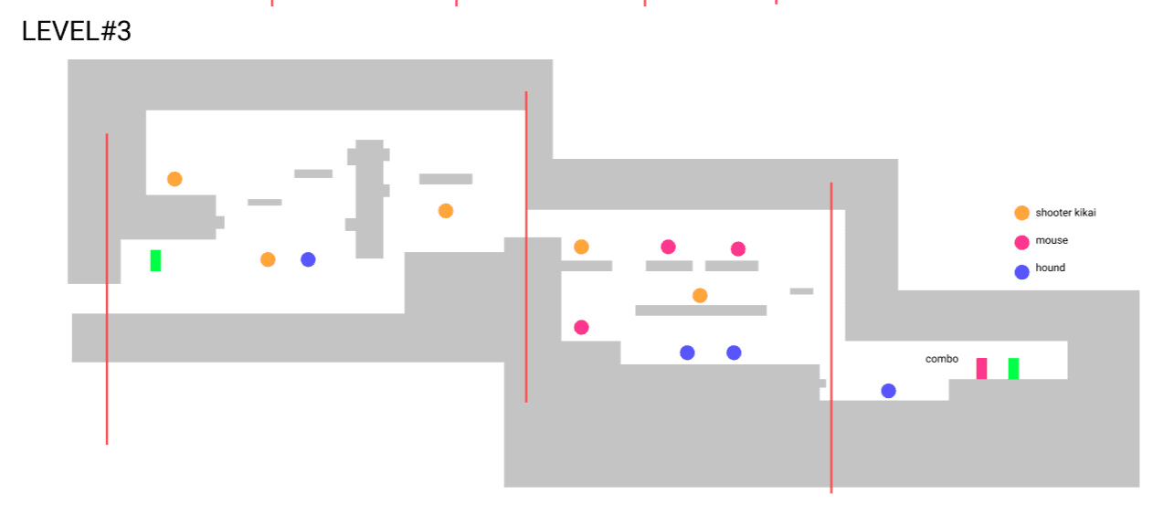 The red lines indicated camera constraints, green boxes as level entry/exits, with different colored pips to indicate enemy type.