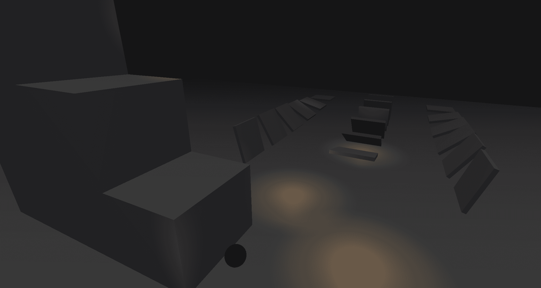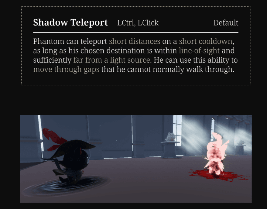 To support this, we created a small course to experiment with how the teleportation mechanic should work within the game. The player feels most powerful when traversing across large fields of darkness, and lit areas indicate soft vertical obstacles that players are unable to cross.