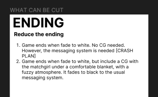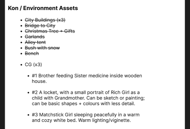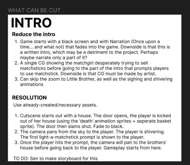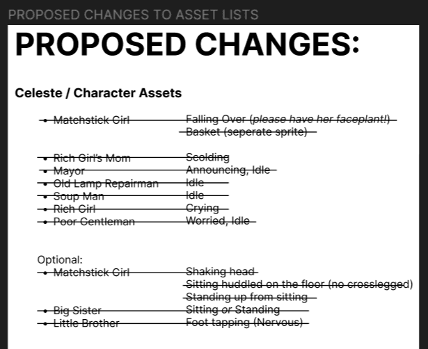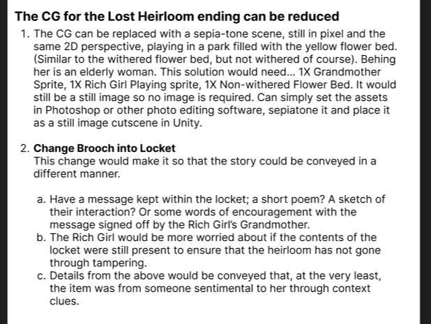 Editing the narrative direction would also affect the scope of work for other team members, so we decided to revise the art assets needed from our artists as well.