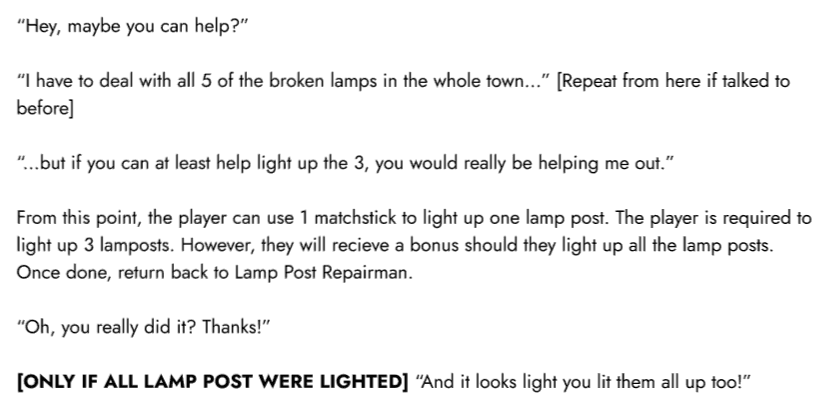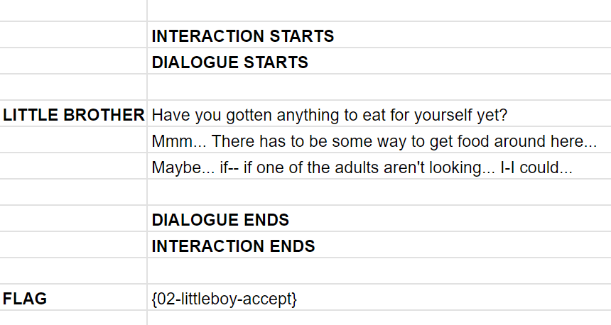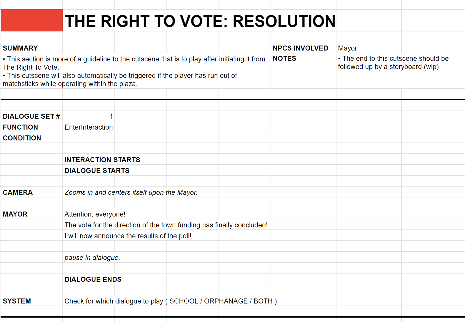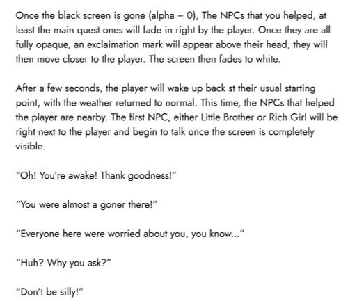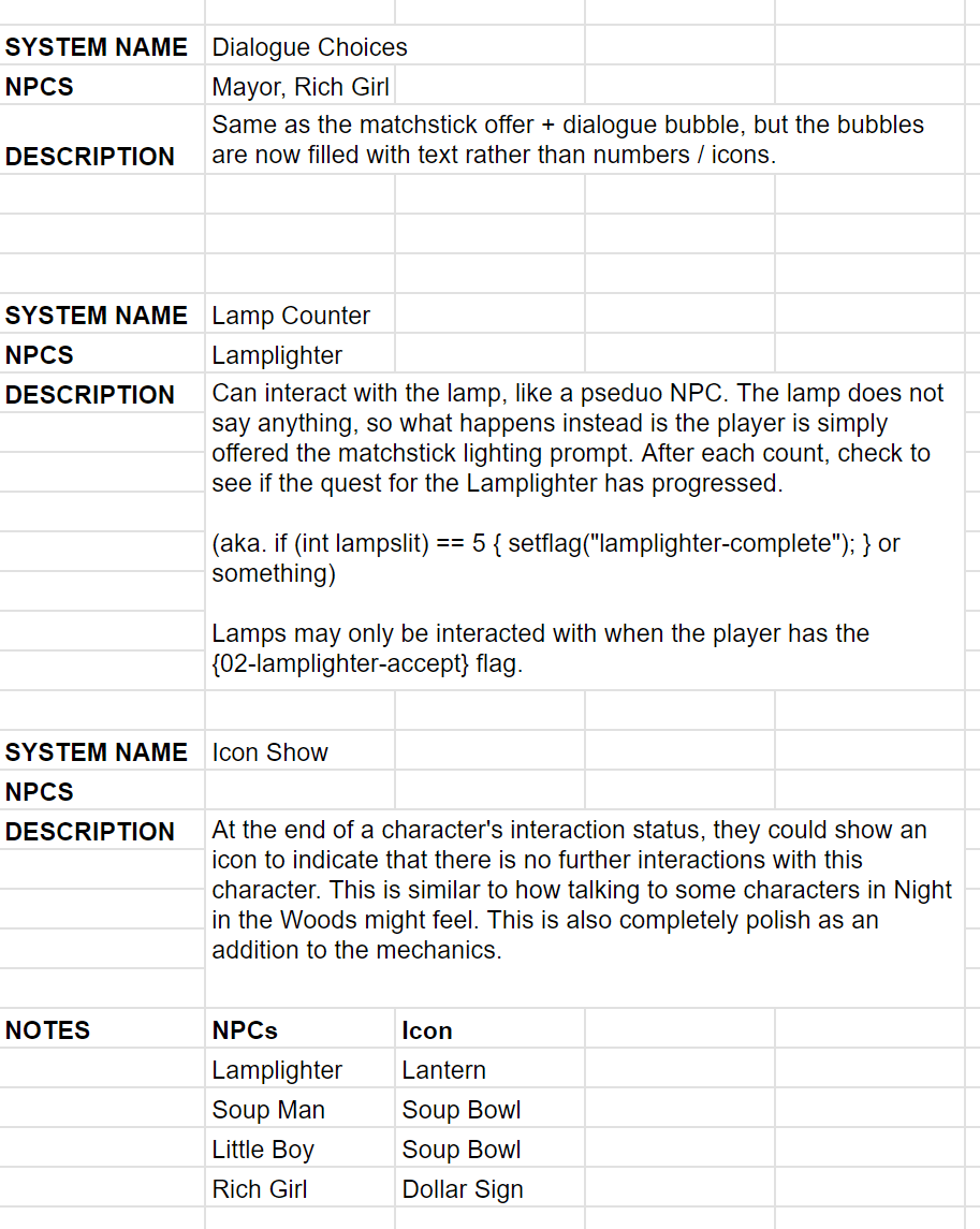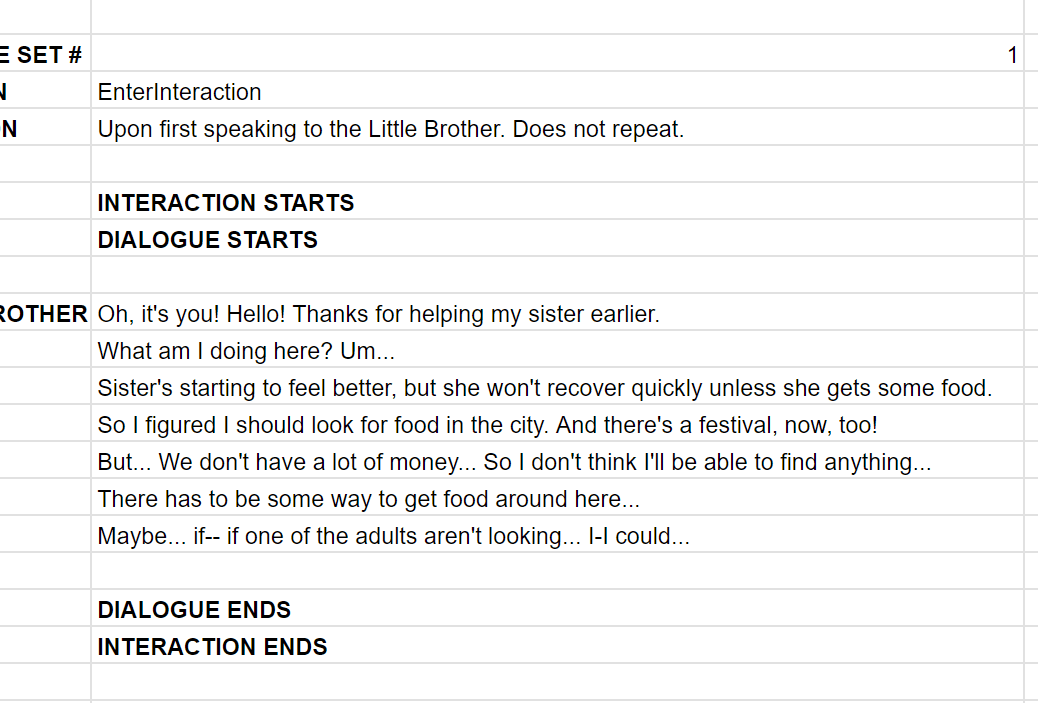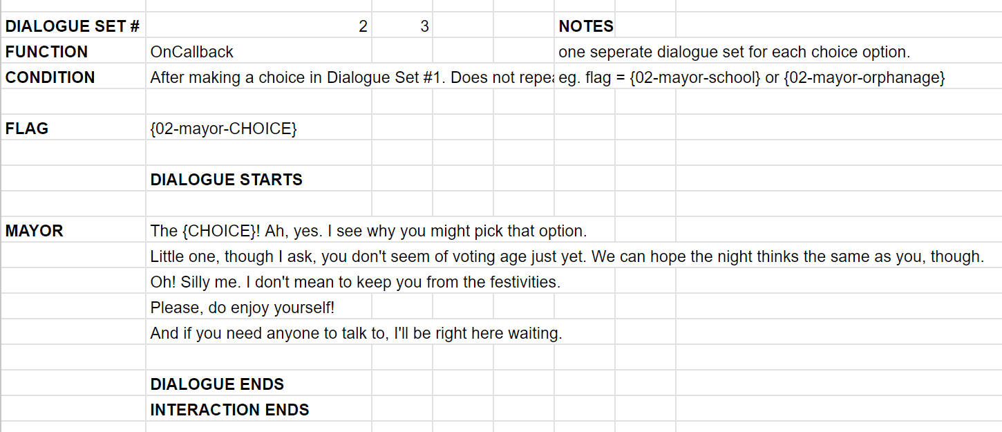 My co-designers and I worked on the quest dialogue together afterwards on Excel. I had illustrated cues as to where System interactions would go, such as activating Story Flags or keeping track of Dialogue Sets in relation to the quest.