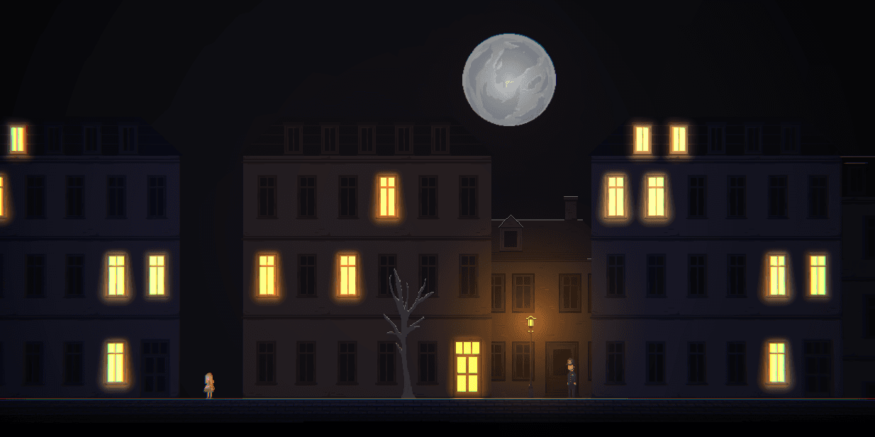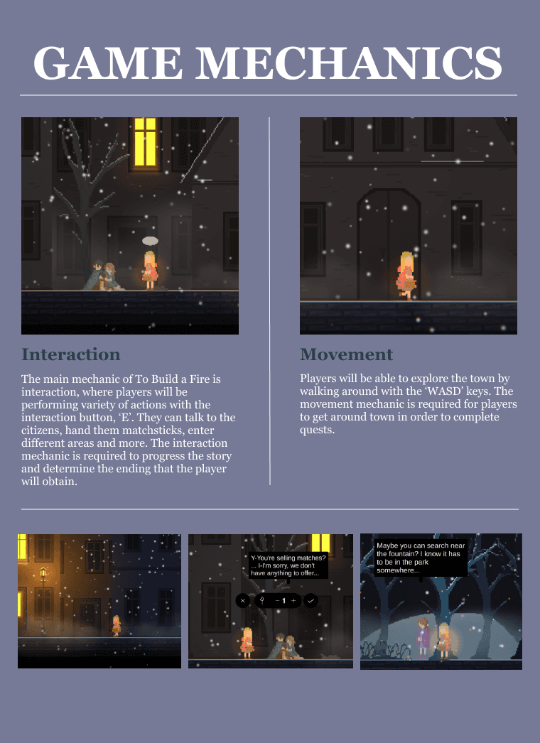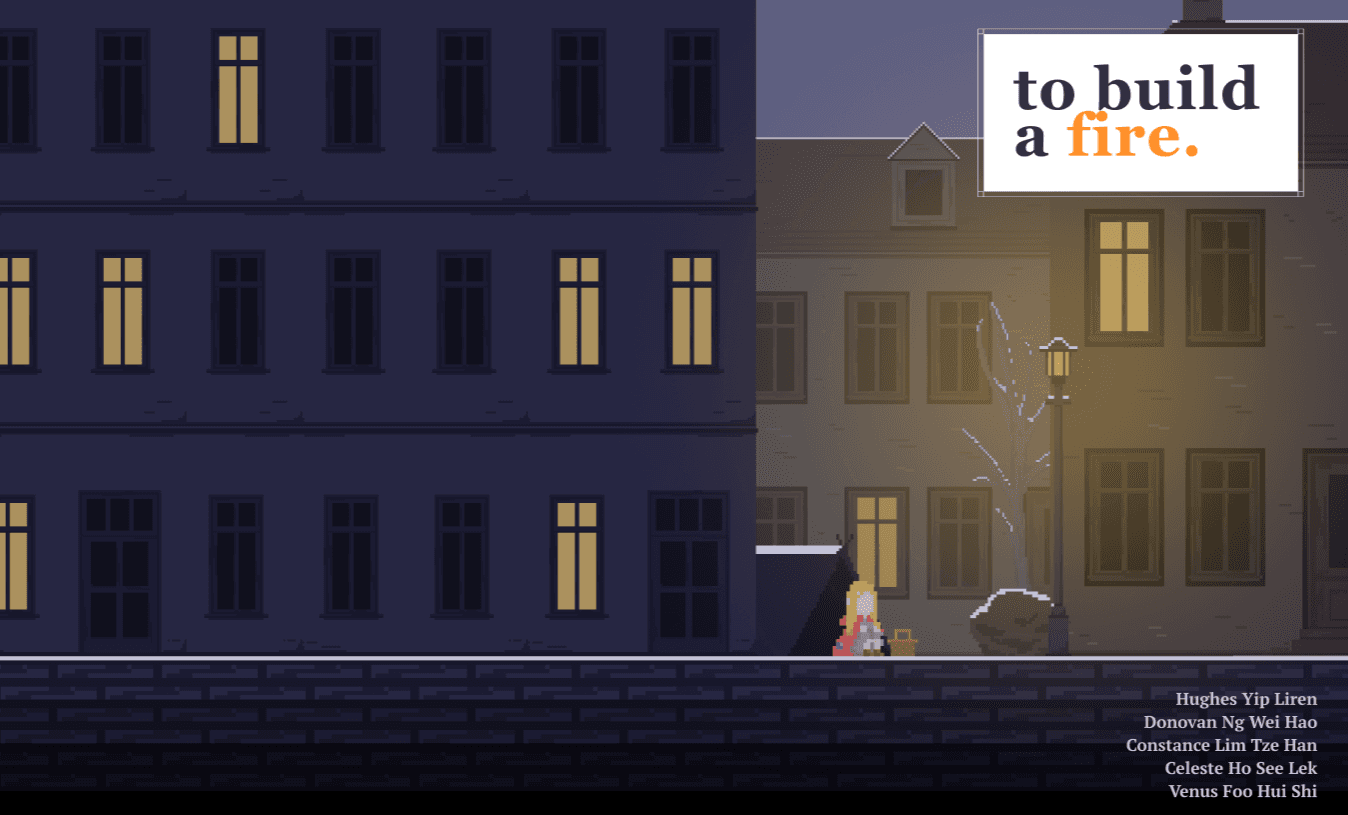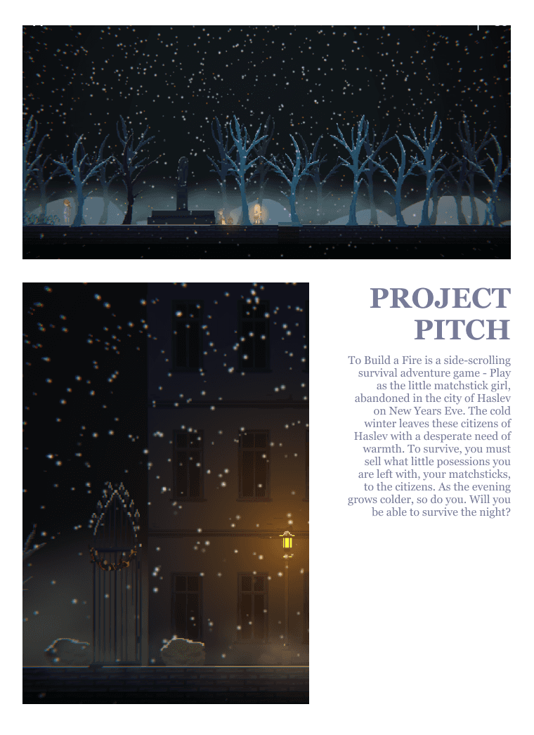 TO BUILD A FIRE is a 2D Side-Scrolling Survival Adventure Game. Play as a Little Match Girl abandoned in the city of Haslev on New Years Eve. You intend to sell what little possessions you have left – your matchsticks. Wander around darkened streets and meet citizens who are in need of warmth and help. As the evening grows cold, so do you. Will you be able to survive the night?