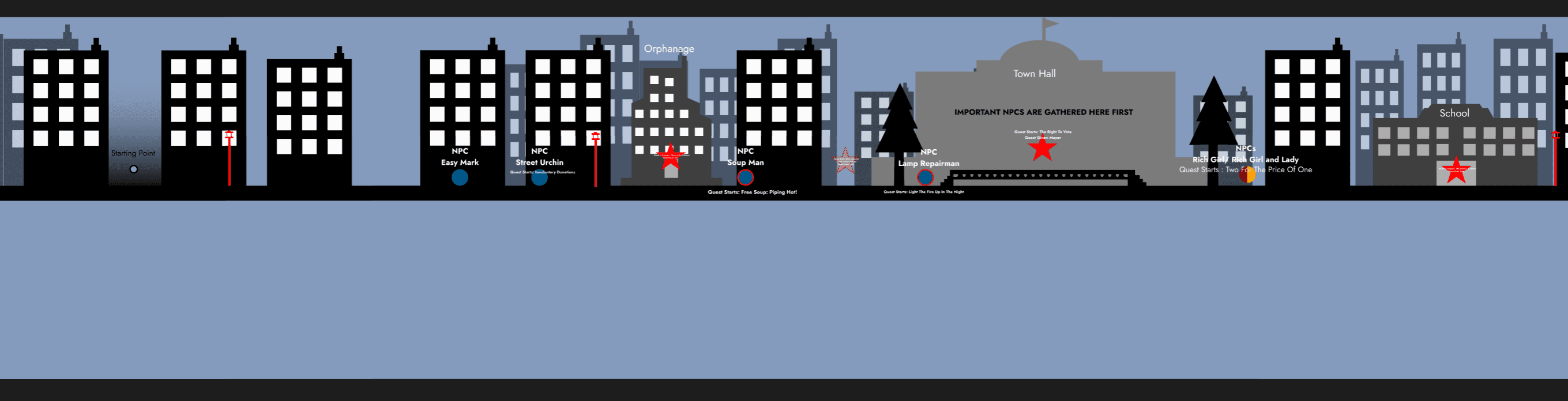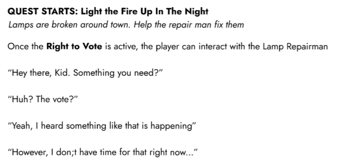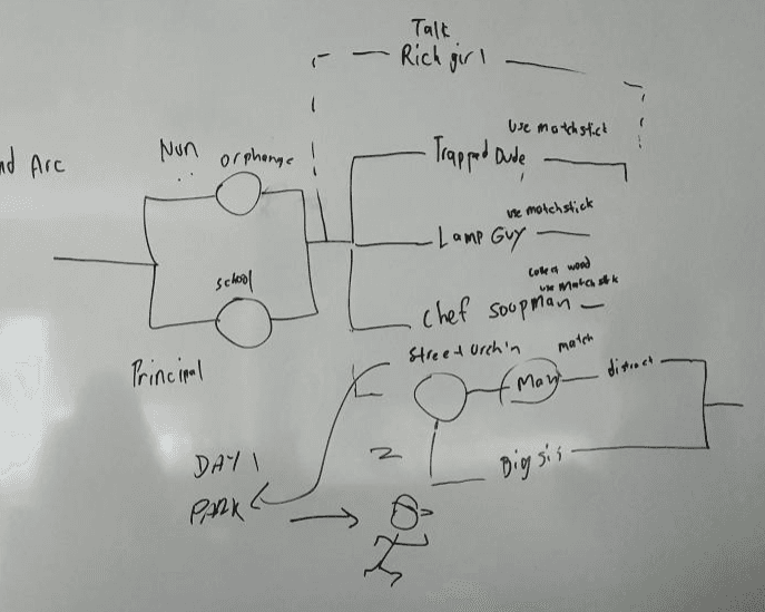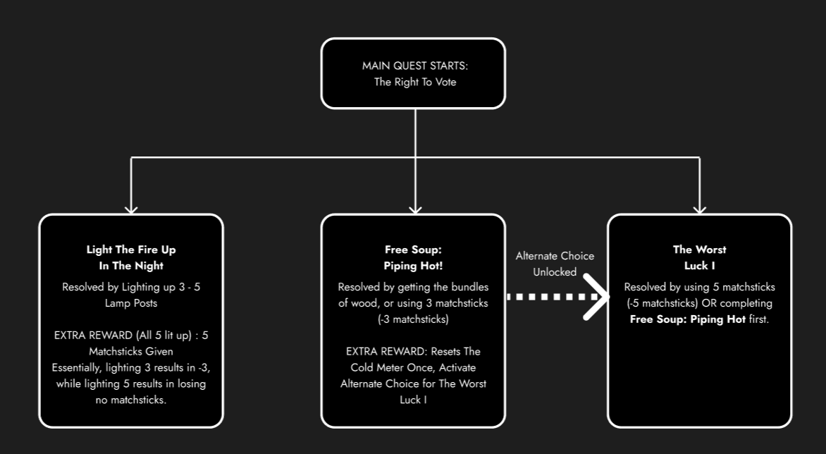 As development continued, we decided to cut down on the project scope to maintain quality for a product we could deliver. I stepped in here to help revise some of their efforts to better align the narrative direction towards branching paths and weight behind player choice.