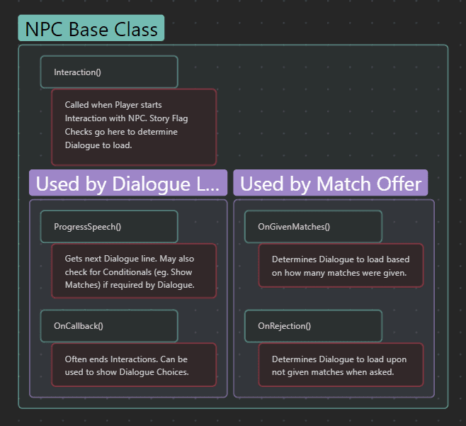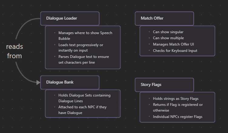 As the Systems Lead, I worked on implementing the Dialogue System first alongside the Match Offering system to facilitate this. I had to ensure that from these systems, my co-designers could implement and set dialogue for individual NPCs.