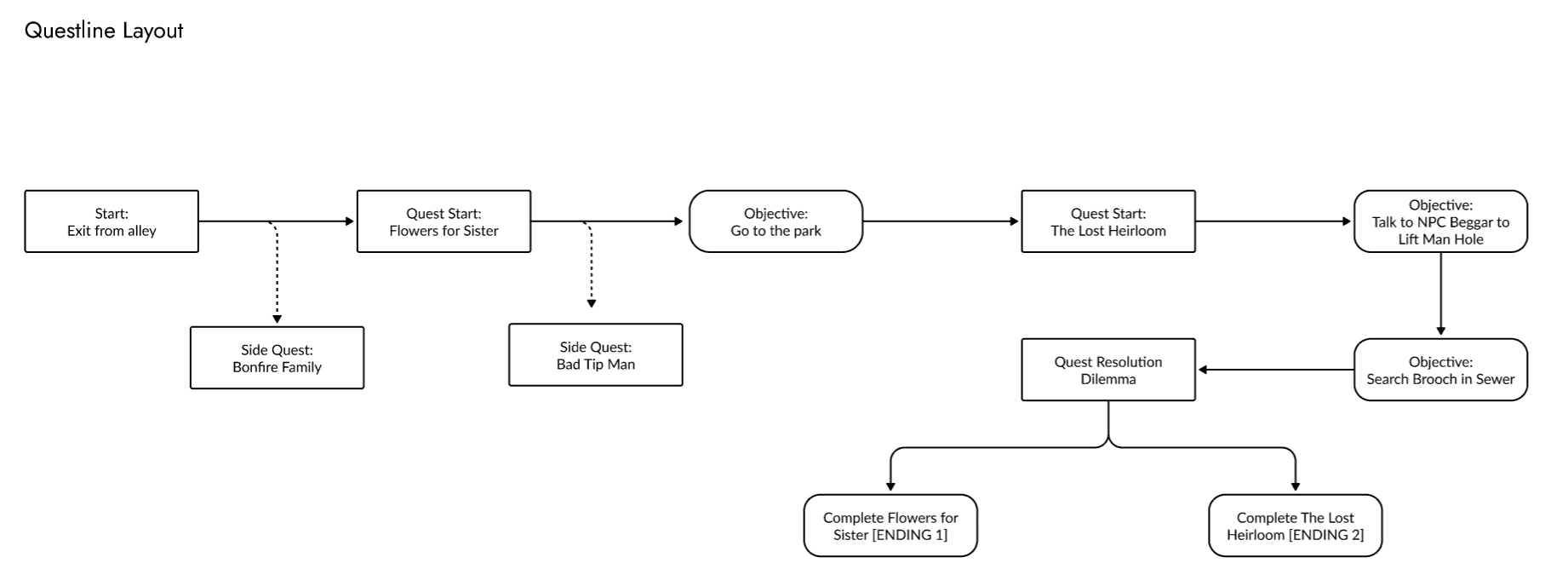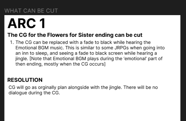 After revising the project scope, I also drafted requirements for what new scripts would be needed to facilitate the new Narrative Direction of the game. These were for my co-designers, as I required assistance while working on other parts of the project.