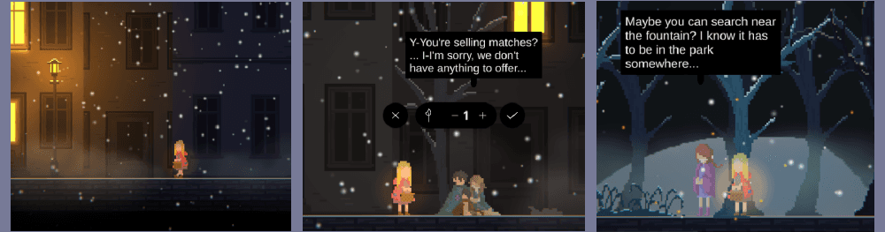 Play as a Little Match Girl abandoned in the city of Haslev on New Years Eve. You intend to sell what little possessions you have left – your matchsticks. Wander around darkened streets and meet citizens who are in need of warmth and help. As the evening grows cold, so do you. Will you be able to survive the night?