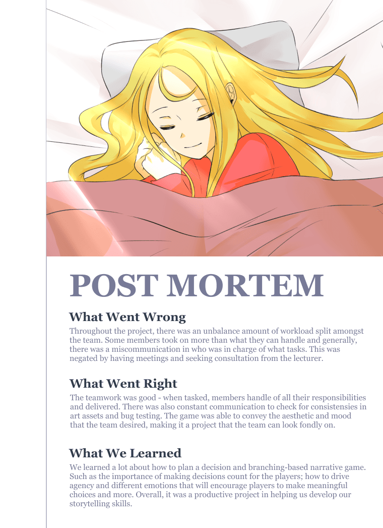 As a Narrative Designer, I participated in organizing the structure of the story, in relation to the game's multiple endings, alongside writing dialogue for some of the game's characters.