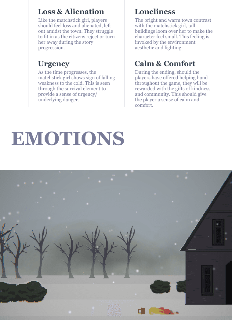 From these two short stores, themes of a Winter Eve on New Years could be drawn, while the player character struggles for survival. Ideas such as family, poverty, escapism and death could be emphasized by the potential Project Manager.